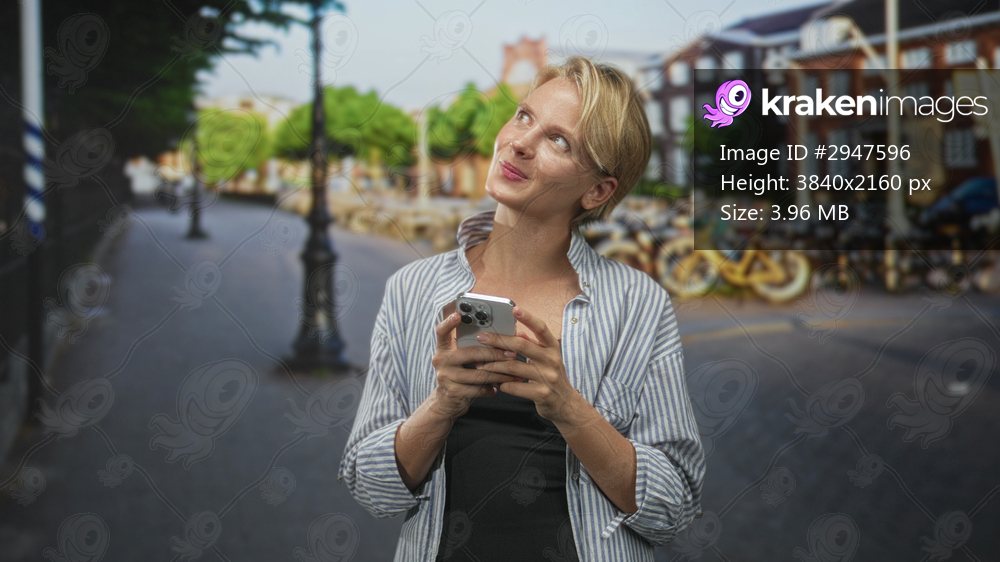 Woman holding smartphone, smiling and looking up on street lined with bicycles and red brick buildings; curiosity.