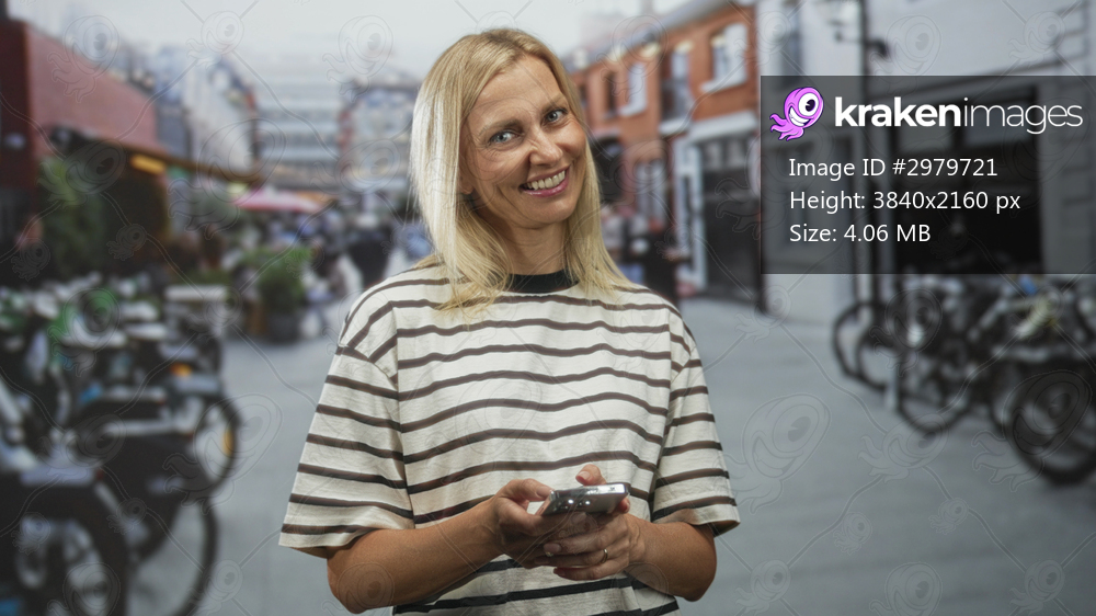 Woman holding smartphone smiling on a city street beside bicycles and cafes; contentment social connection.