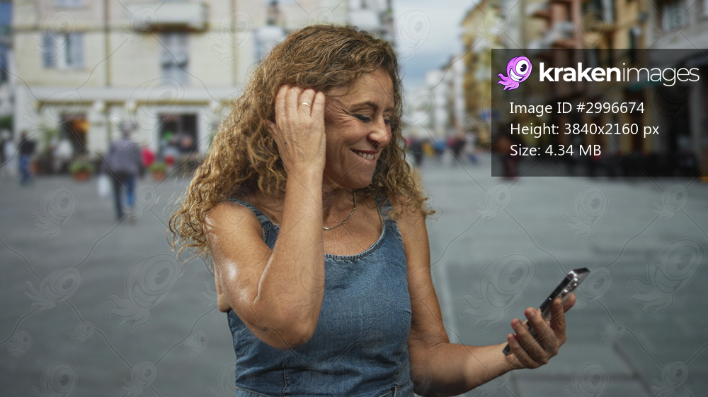Woman holding smartphone and smiling on a street plaza, wearing denim dress and necklace; joyful moment.