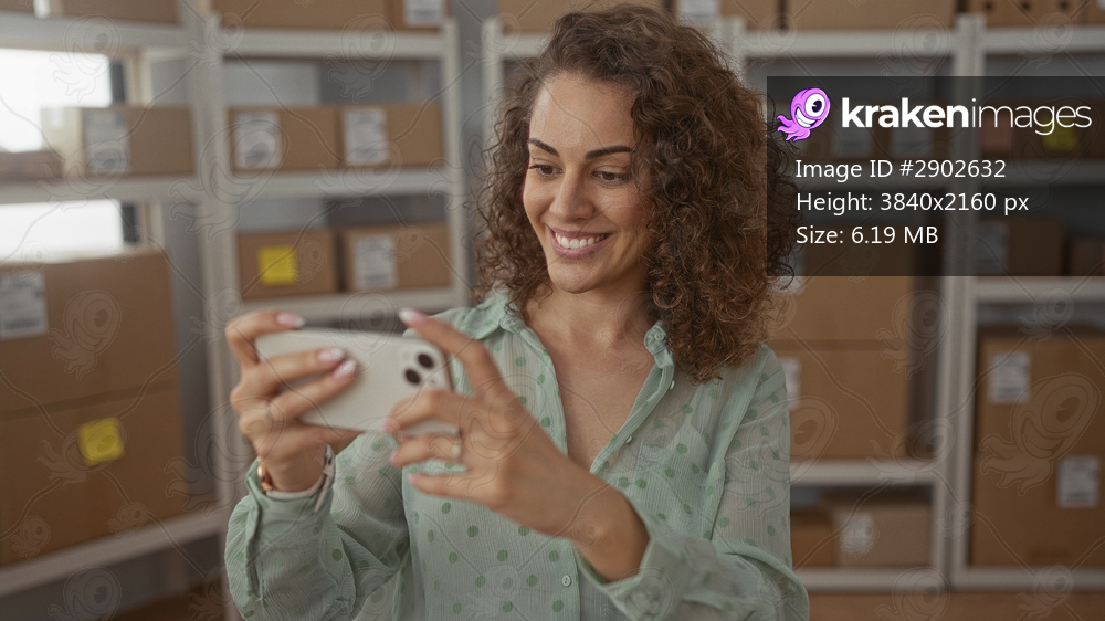 Woman holding smartphone, smiling and pumping fist amid parcel shelves in a building warehouse; small business success joy.
