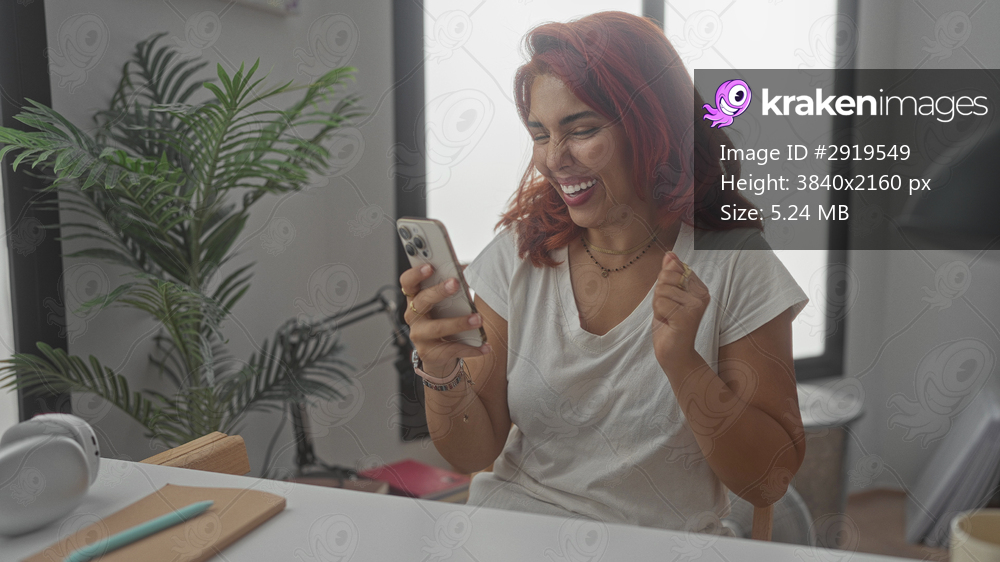 Woman holding smartphone, smiling and pumping fist at desk in a building office; joy connection celebration.