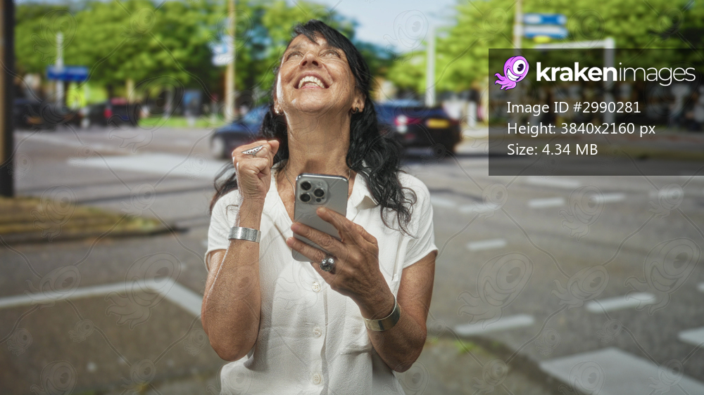 Woman holding smartphone, smiling and raising fist in a celebratory fist pump on a city street crosswalk while checking phone; triumph joy.