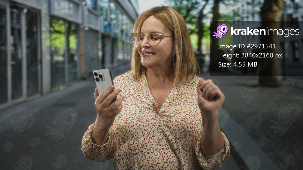Woman holding smartphone, smiling and raising her hand in a small celebratory gesture while walking on a city street lined with glass storefronts; joy connection. - Kraken Images