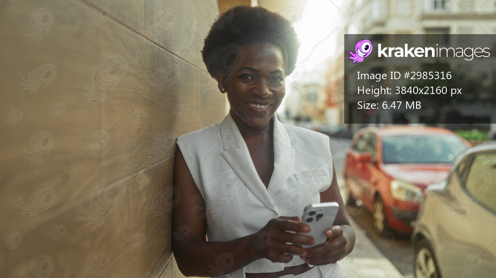 Woman holding smartphone, smiling and tapping screen while leaning against a wall on a city street; contentment everyday connection.