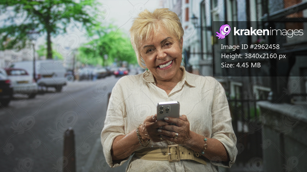Woman holding smartphone, smiling and typing with both hands on a city street beside a building railing; joyful connection.