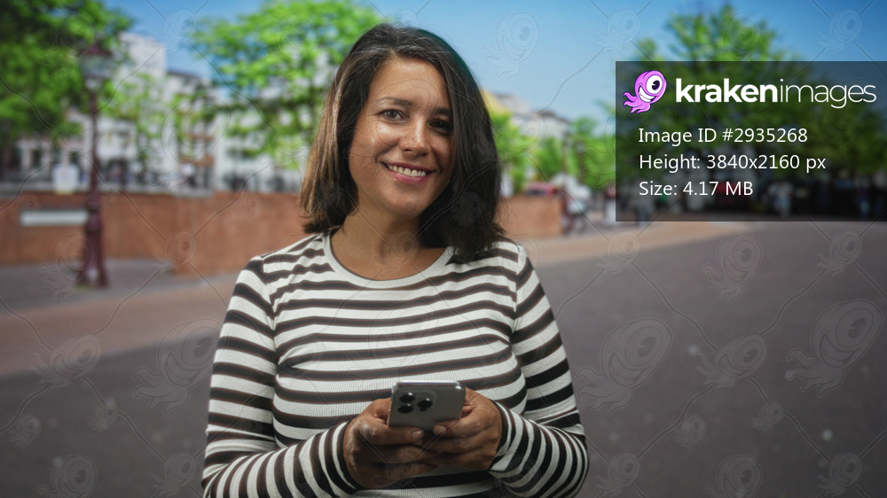 Woman holding smartphone, smiling and typing while looking down on a city street; everyday connection contentment.