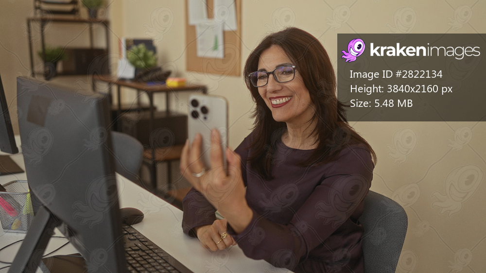 Woman holding smartphone and smiling and waving at computer screen in office at desk; connection bonding happiness.