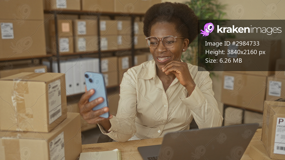 Woman holding smartphone, smiling and waving hand while seated at desk with laptop and packed boxes in a storage building; entrepreneurial joy.