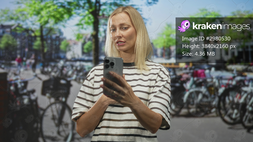 Woman holding smartphone and smiling while checking screen on street near bicycles; connection contentment.