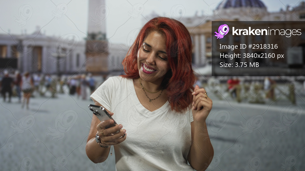 Woman holding smartphone and smiling while looking at screen in vatican square building; travel joy.
