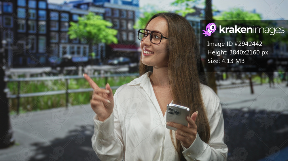 Woman holding smartphone and smiling while looking to the side on a sunny street beside a canal and row of buildings; urban connection contentment.