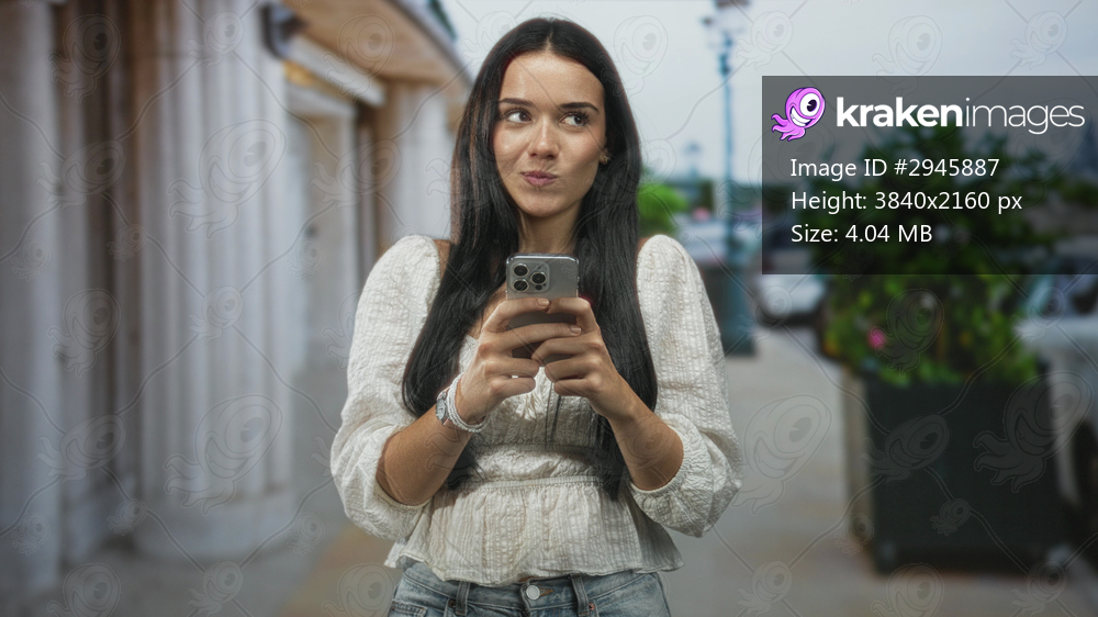 Woman holding smartphone, smiling while texting on a street in front of a building planter and parked cars; joy casual connection.
