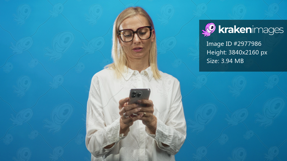 Woman holding smartphone and smiling while typing with both hands in a studio, wearing glasses and white blouse; joy connection.
