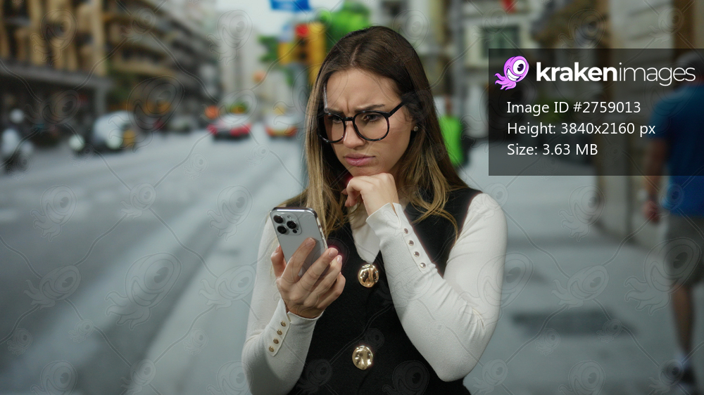 Woman holding smartphone standing thoughtful on a busy urban street background wearing glasses and fashionable attire outdoors.