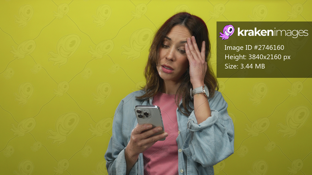 Woman holding smartphone with surprised expression on isolated yellow background, wearing casual clothes, showcasing hispanic descent and modern technology use.