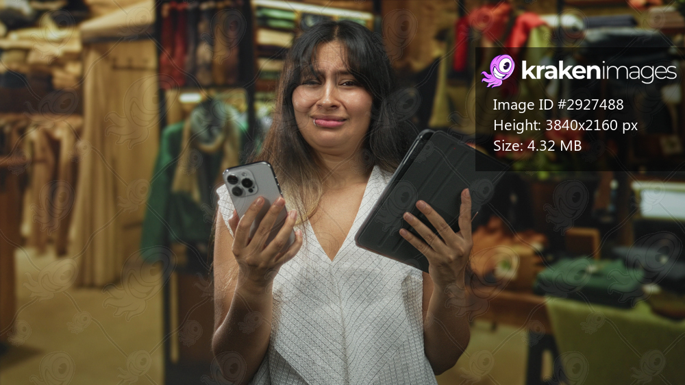 Woman holding smartphone and tablet in a retail building clothing store, frowning and squinting while comparing screens; shopping frustration indecision. - Kraken Images