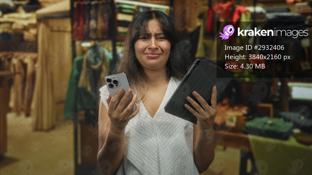 Woman holding smartphone and tablet in a retail building clothing store, frowning and squinting while comparing screens; shopping frustration indecision. - Kraken Images