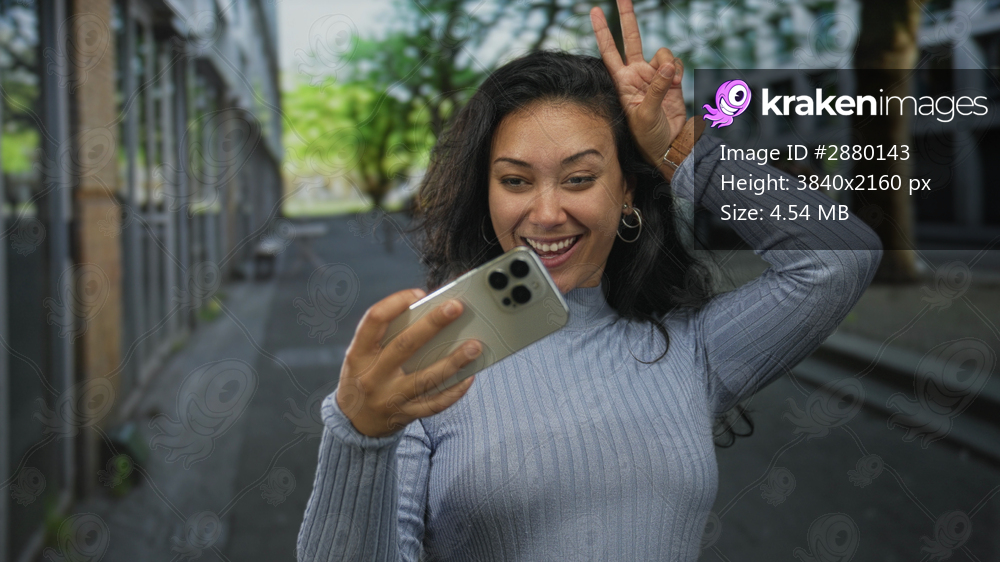 Woman holding smartphone takes selfie and makes peace sign while smiling on city street near building facades; joy playfulness.