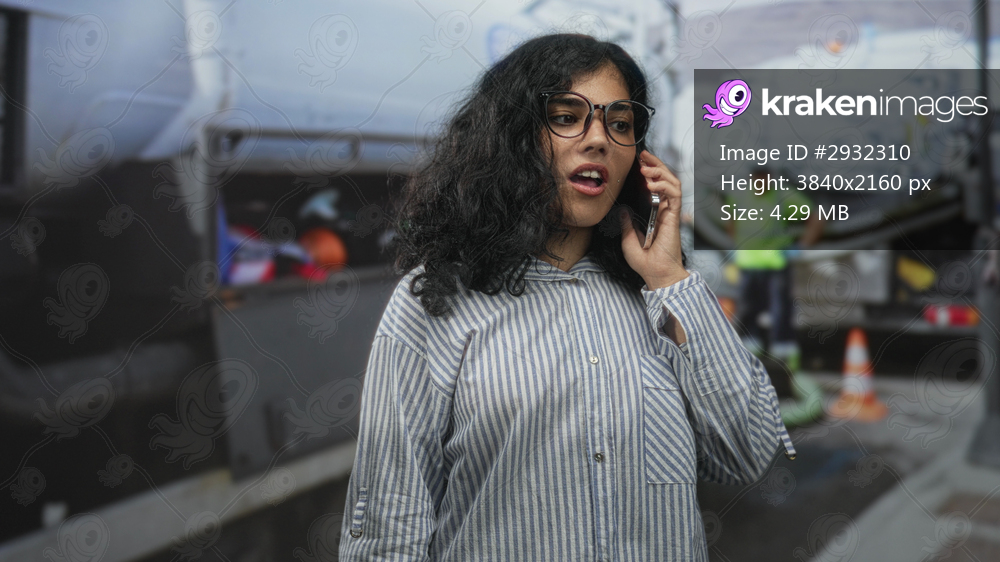 Woman holding smartphone and talking on phone on street with construction truck nearby; focused urban life.