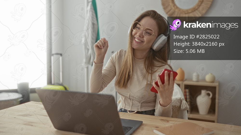 Woman holding smartphone and tapping finger at screen in office, wearing headphones and smiling at laptop; joy.