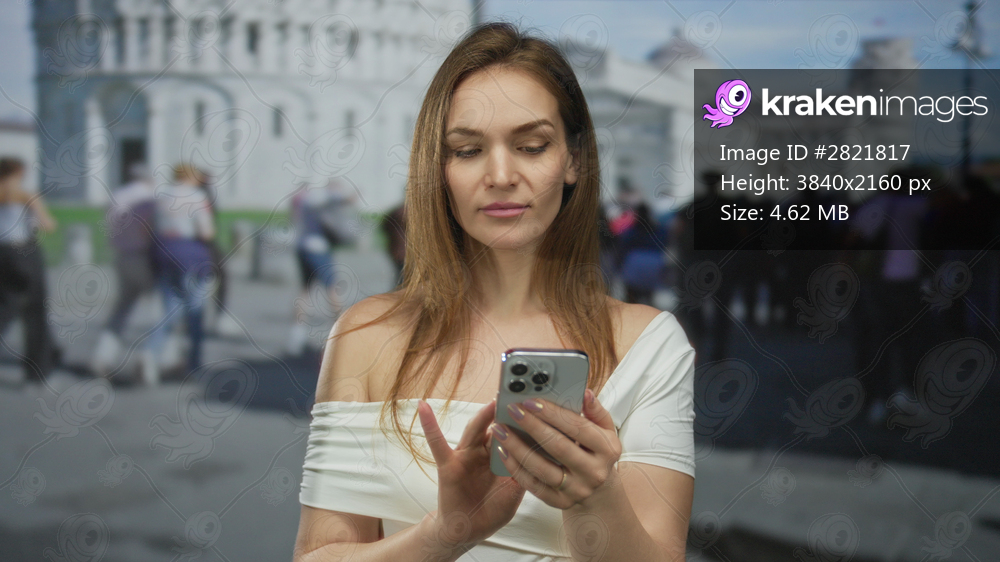 Woman holding smartphone tapping finger to screen in front of pisa tower building; serene digital exploration connection.