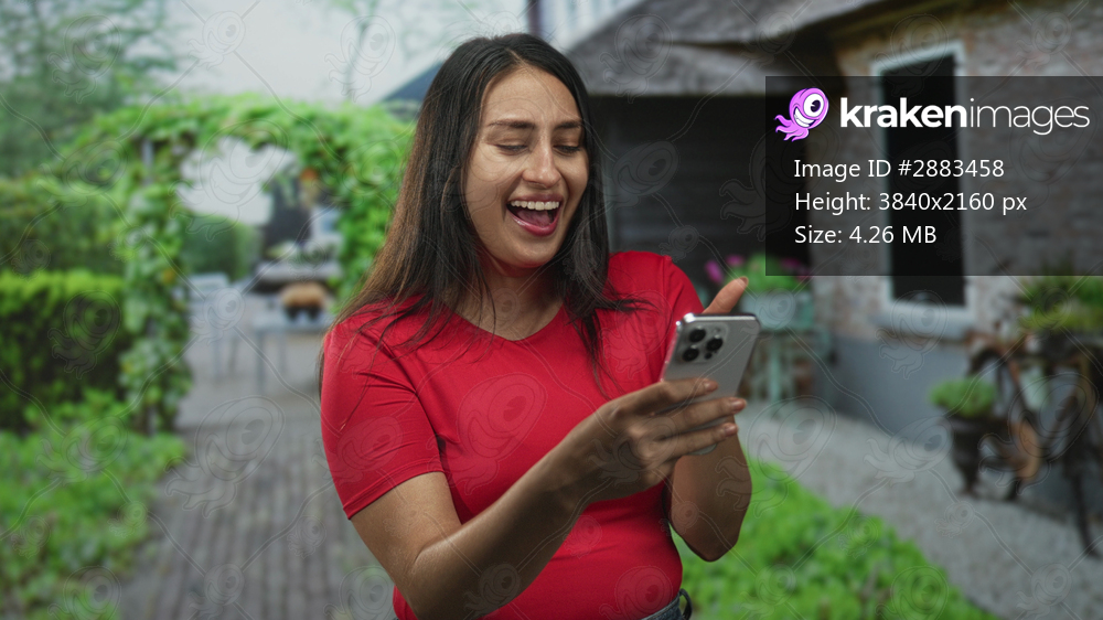 Woman holding smartphone and tapping screen at building entrance while laughing and smiling; joy connection.
