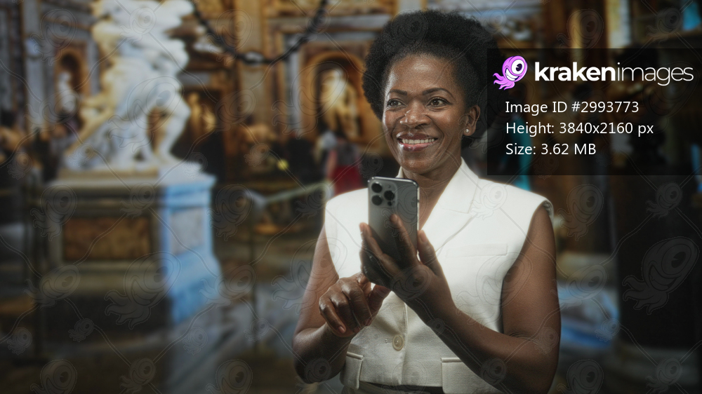 Woman holding smartphone tapping screen with finger while smiling among classical sculptures in an ornate museum building; delight travel memory.
