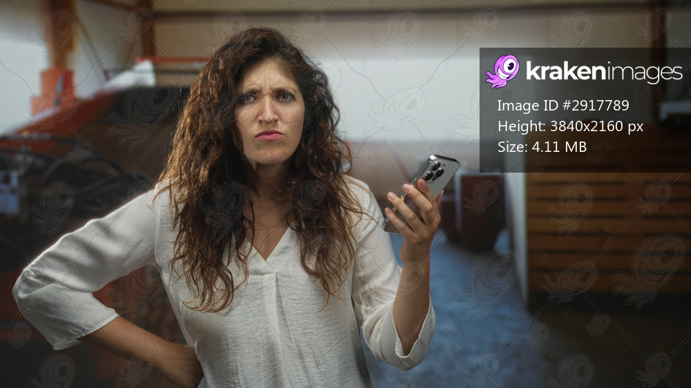 Woman holding smartphone and tapping screen in building interior, wearing white blouse, curly hair, hands visible and focused while looking puzzled; confusion. - Kraken Images