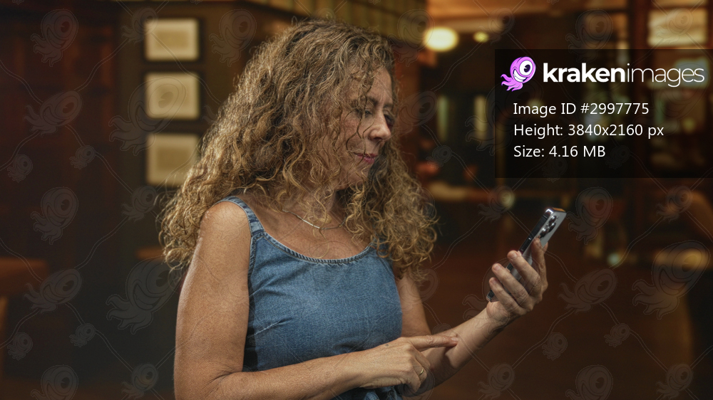 Woman holding smartphone, tapping screen with index finger inside hotel building; quiet concentration.