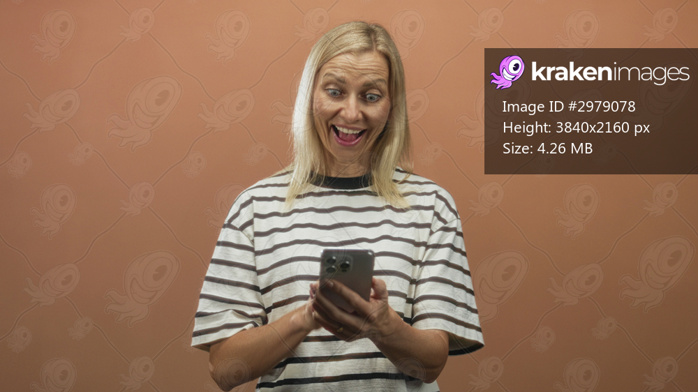 Woman holding smartphone and tapping screen, smiling while checking messages with finger and hands visible in studio; simple joy.