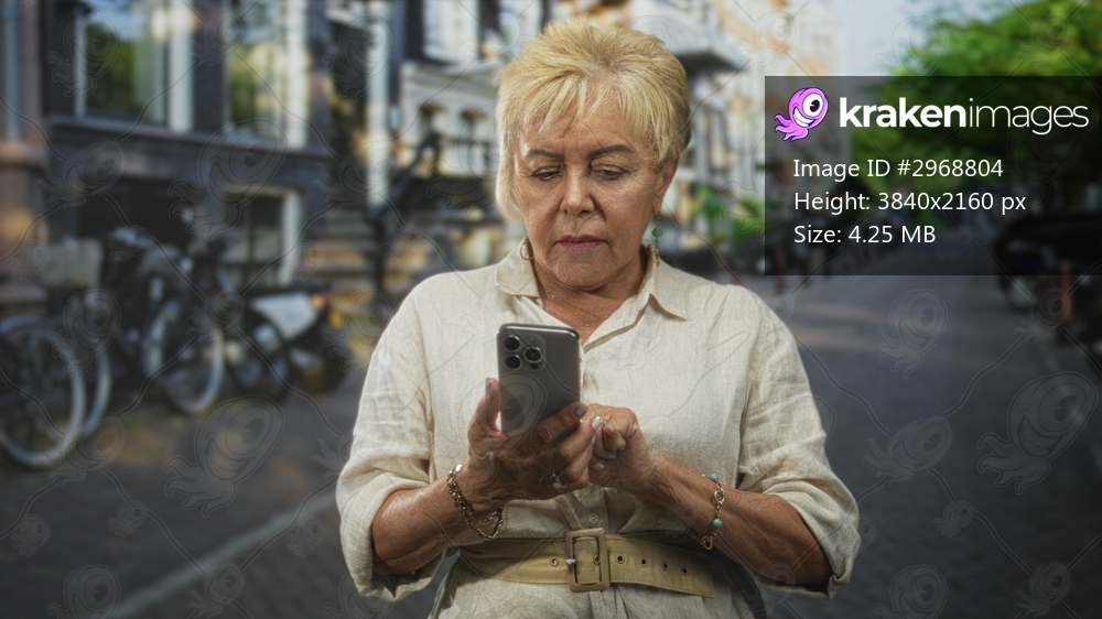 Woman holding smartphone and tapping screen with thumb on a european street lined with bicycles and buildings; contemplative focus.