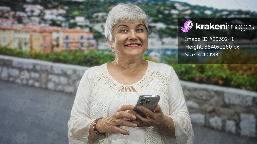Woman holding smartphone and tapping screen while smiling, both hands visible over stone wall on street; calm connection.