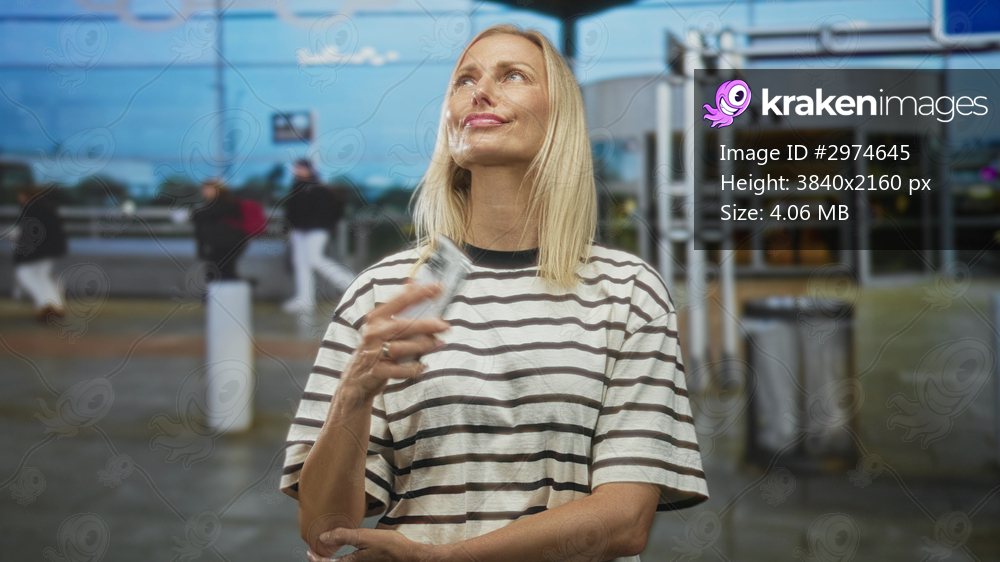 Woman holding smartphone and tapping screen while standing near airport entrance with bollard and trash bin visible; concern waiting patience.
