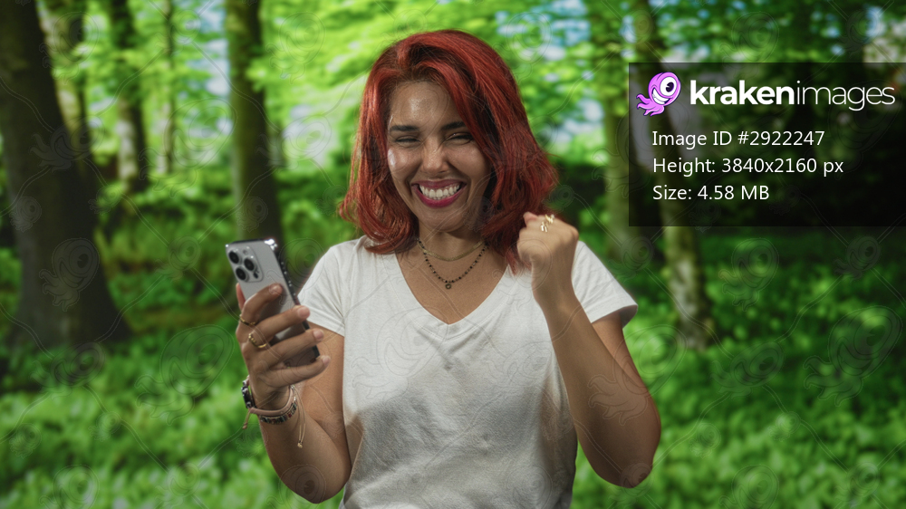 Woman holding smartphone and texting with a fist pump in forest surrounded by green trees and grass; joy connection celebration.