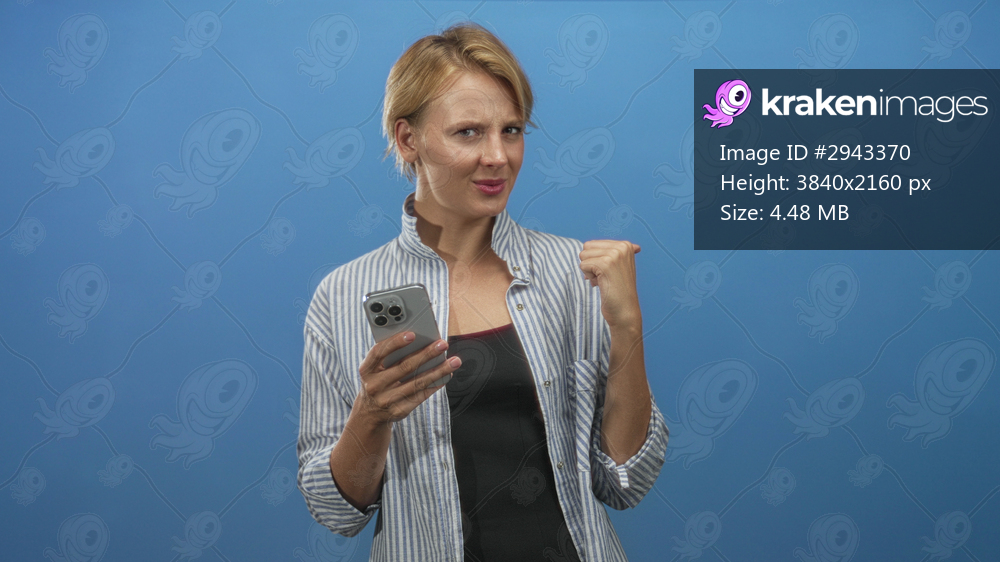 Woman holding smartphone, texting and smiling while glancing at the screen in a blue studio wearing a striped shirt; triumph confidence.