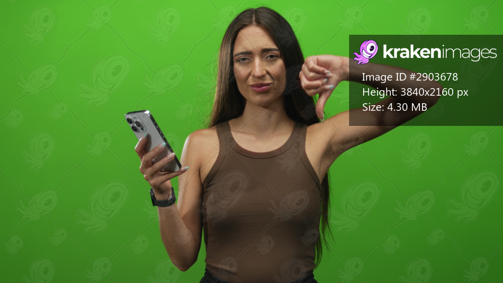 Woman holding smartphone with thumb down gesture and skeptical expression in green studio; tech frustration.