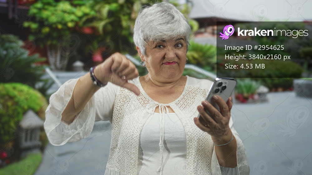 Woman holding smartphone with thumb down gesture while checking her wrist and pursing lips on a street lined with plants and steps; disapproval skepticism. - Kraken Images