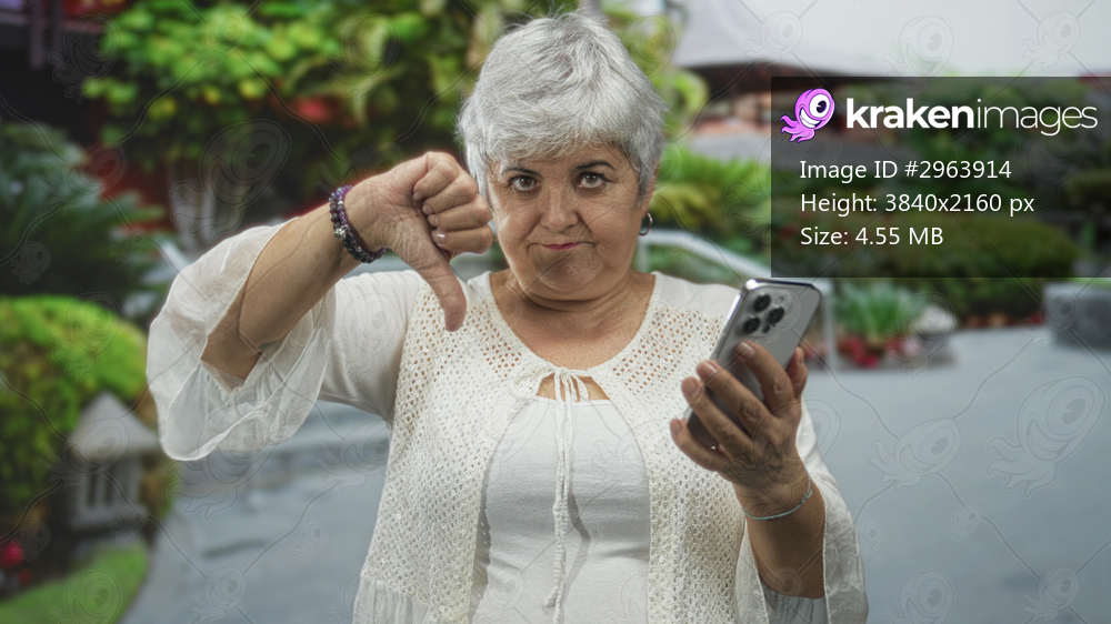 Woman holding smartphone with thumb down gesture while checking her wrist and pursing lips on a street lined with plants and steps; disapproval skepticism. - Kraken Images