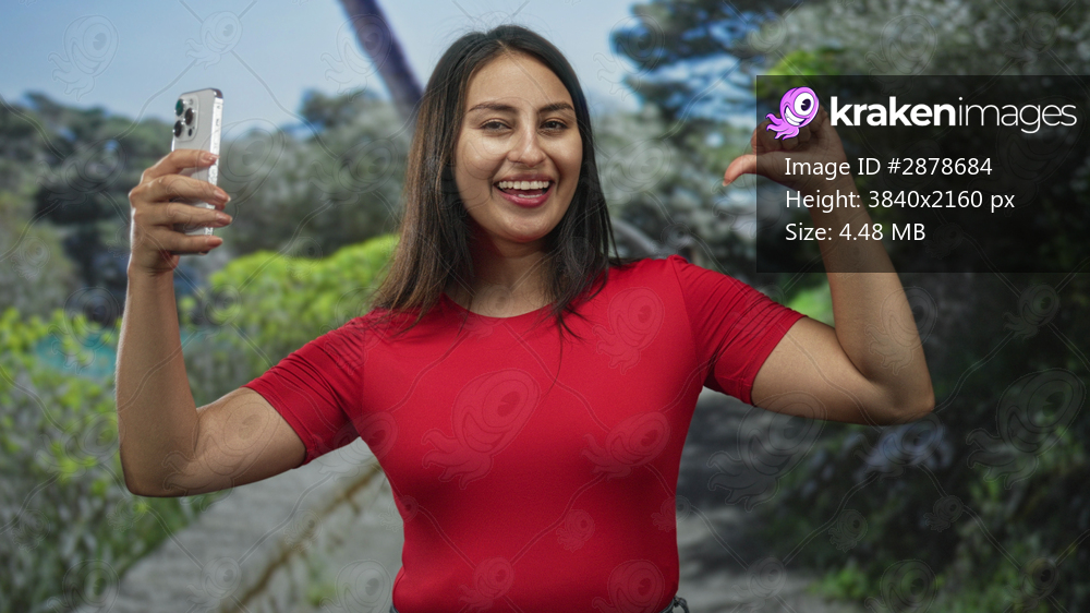 Woman holding smartphone with thumb pointing to chest on forest path, smiling and posing; selfie confidence.