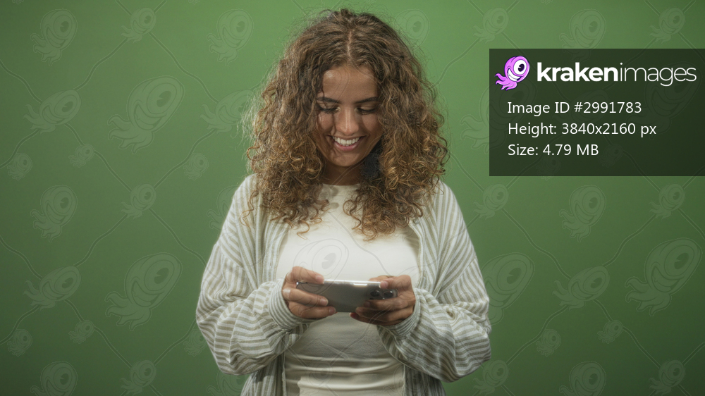 Woman holding smartphone, thumbs typing and smiling while looking down in studio; joyful connection moment.