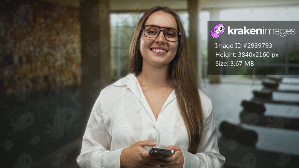 Woman holding smartphone, tilting head and smiling confidently while standing near an indoor spa pool; serenity wellness.
