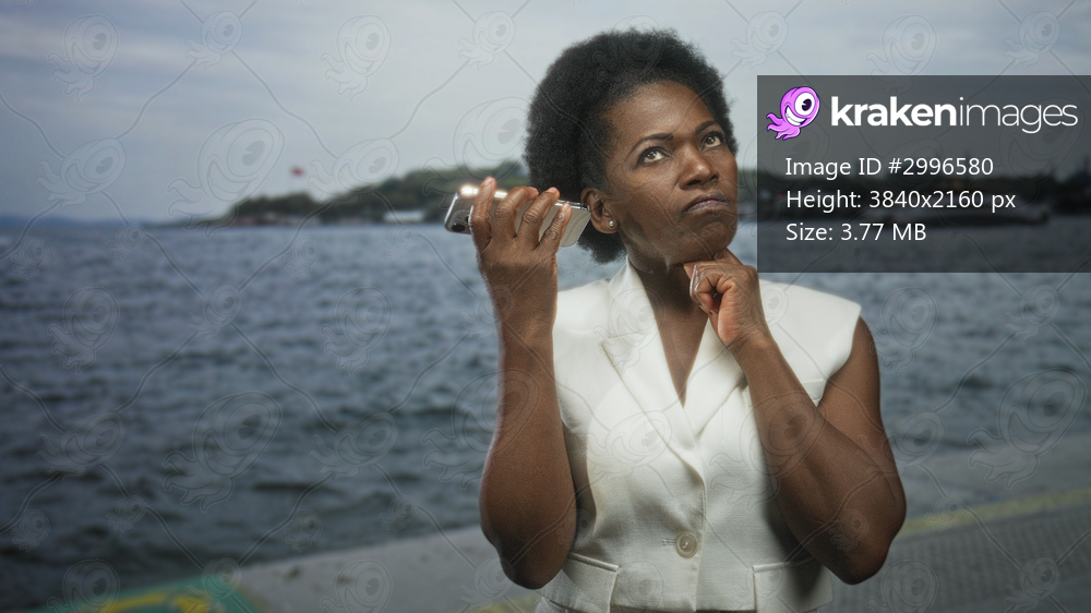 Woman holding smartphone to cheek with chin resting gesture at harbor pier near shore, wearing a white sleeveless vest; pensive doubt.