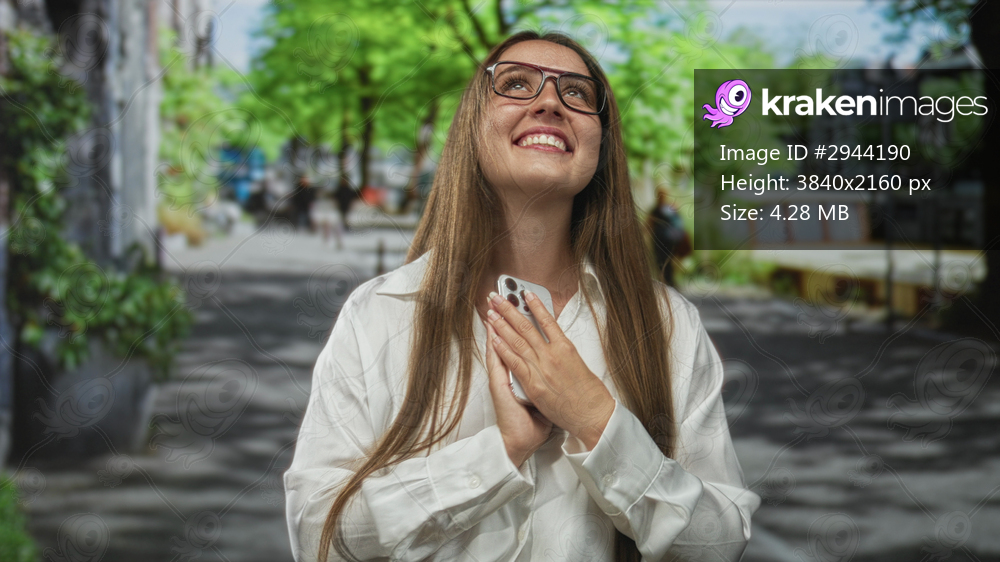 Woman holding smartphone to chest with clasped hands on street smiling and looking up; joy gratitude hope.
