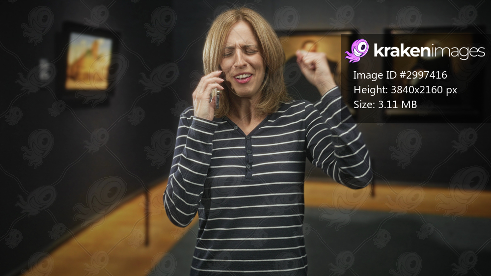 Woman holding smartphone to ear, eyes closed with fist clenched while standing before framed paintings in a gallery building; joy celebration.