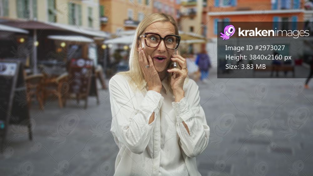 Woman holding smartphone to ear with hand on cheek, smiling and looking upward amid outdoor cafe tables on a busy street;joy connection.