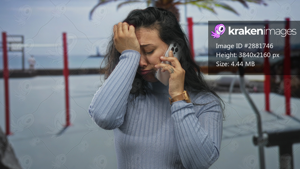 Woman holding smartphone to ear with hand on forehead near outdoor gym bars in street; phone call sadness.
