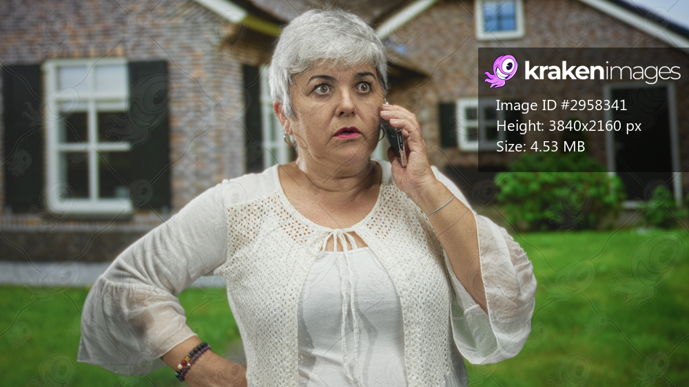 Woman holding smartphone to ear with hand on hip, surprised expression outside in front of building facade and lawn; concern urgency alert.
