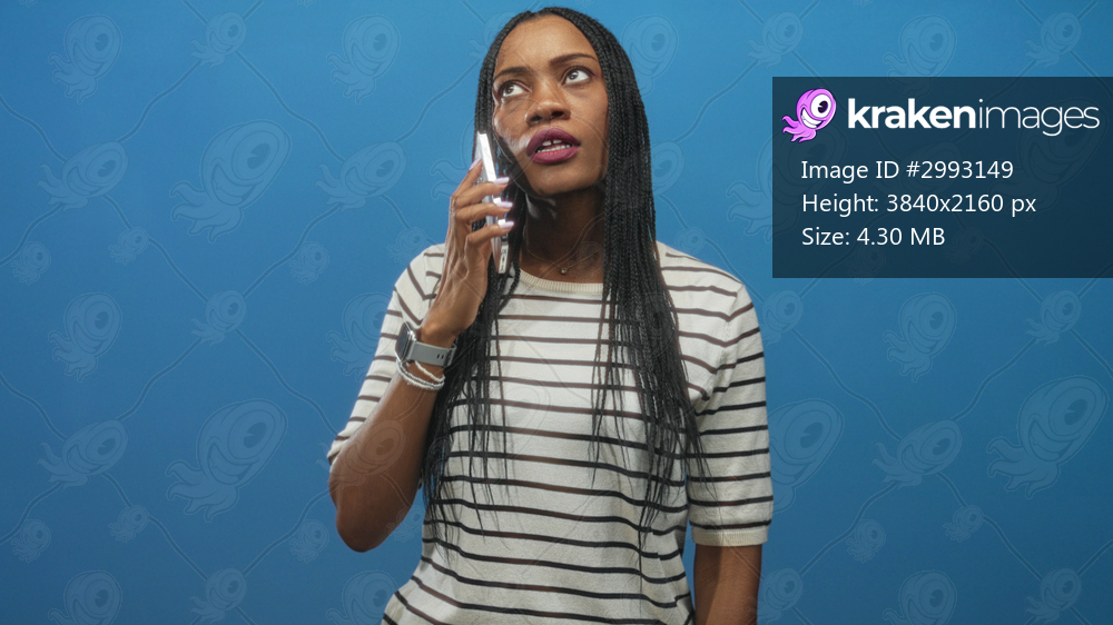 Woman holding smartphone to ear in studio with hand near face showing displeased expression; frustration communication problem.
