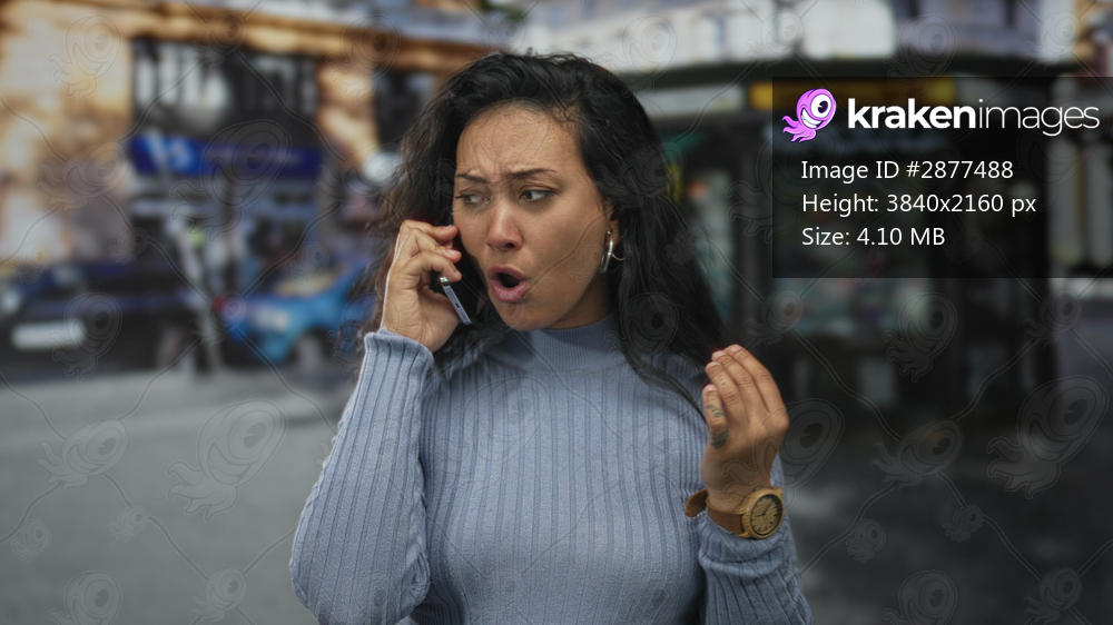 Woman holding smartphone to ear with mouth open and hand raised while speaking loudly on a busy street by a newsstand; frustration.