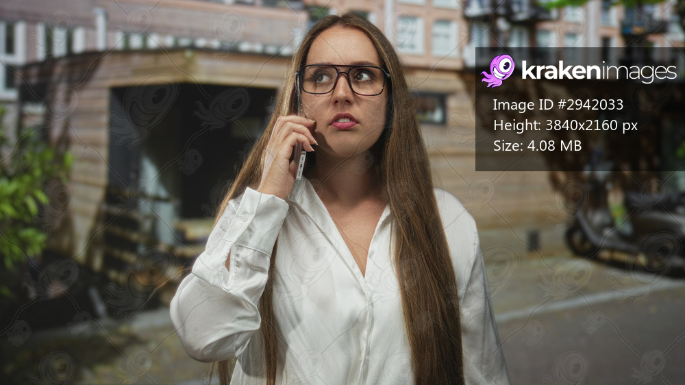 Woman holding smartphone to ear on a street in front of a wooden building and parked scooter, wearing glasses and white blouse; urgent concern.